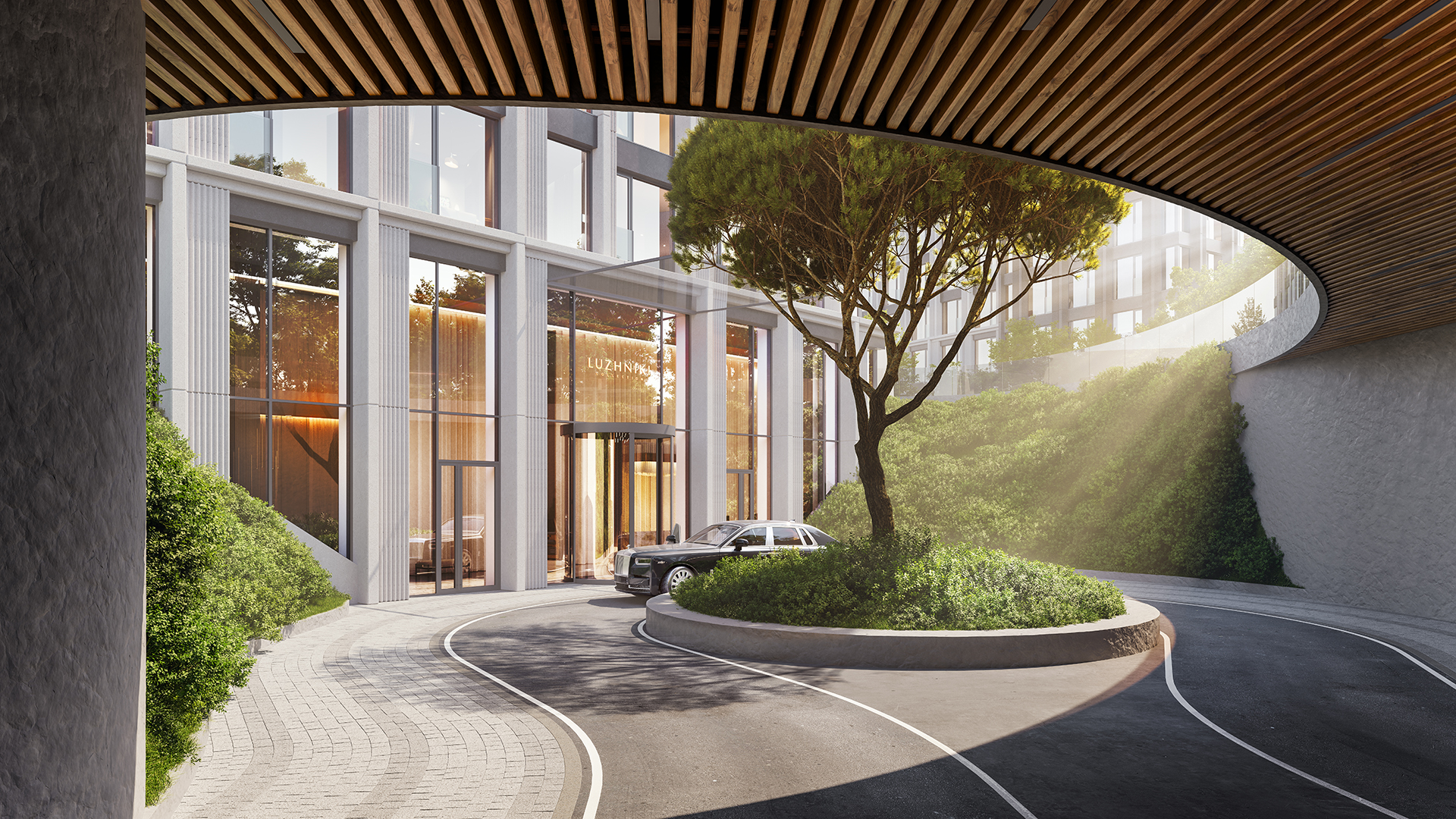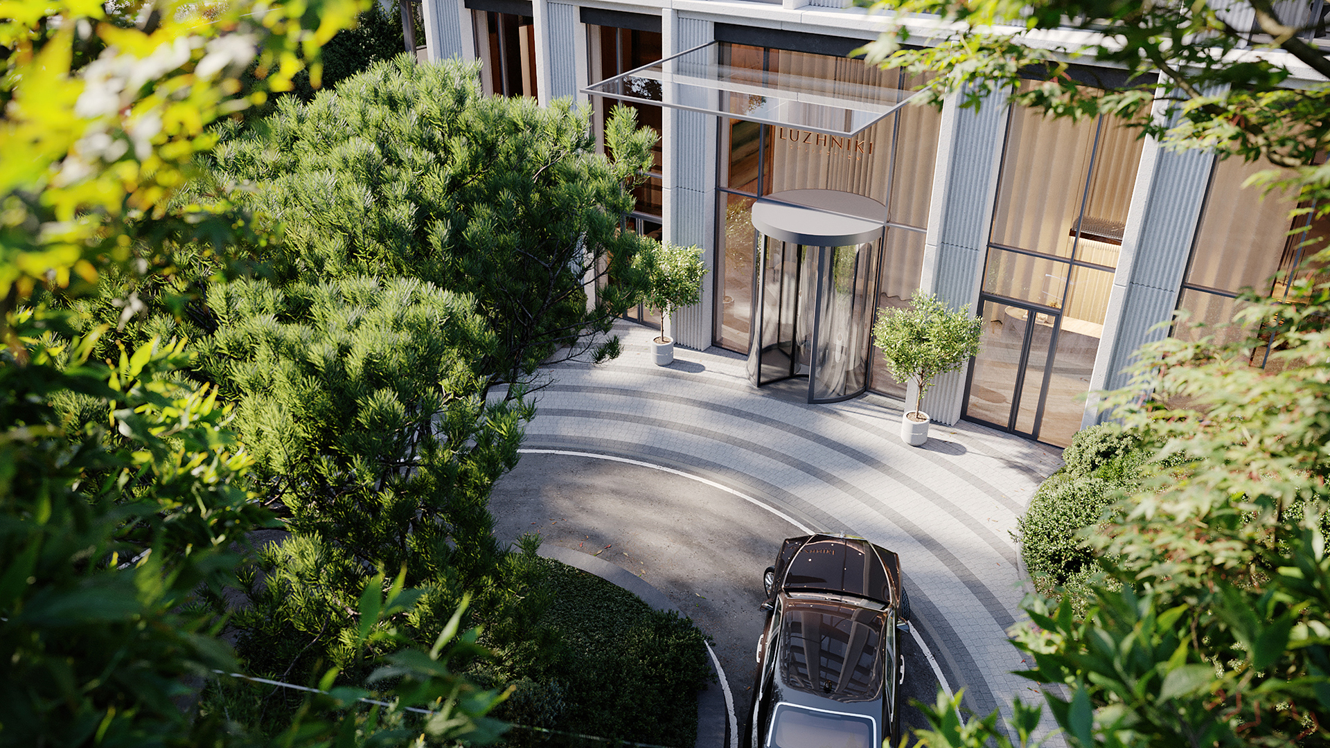 Здесь реализован принцип максимального комфорта и приватности: въезд организован таким образом, чтобы автомобильное движение не пересекалось с прогулочными зонами и приватным парком. Благодаря концепции подиума вся территория двора полностью свободна от машин.