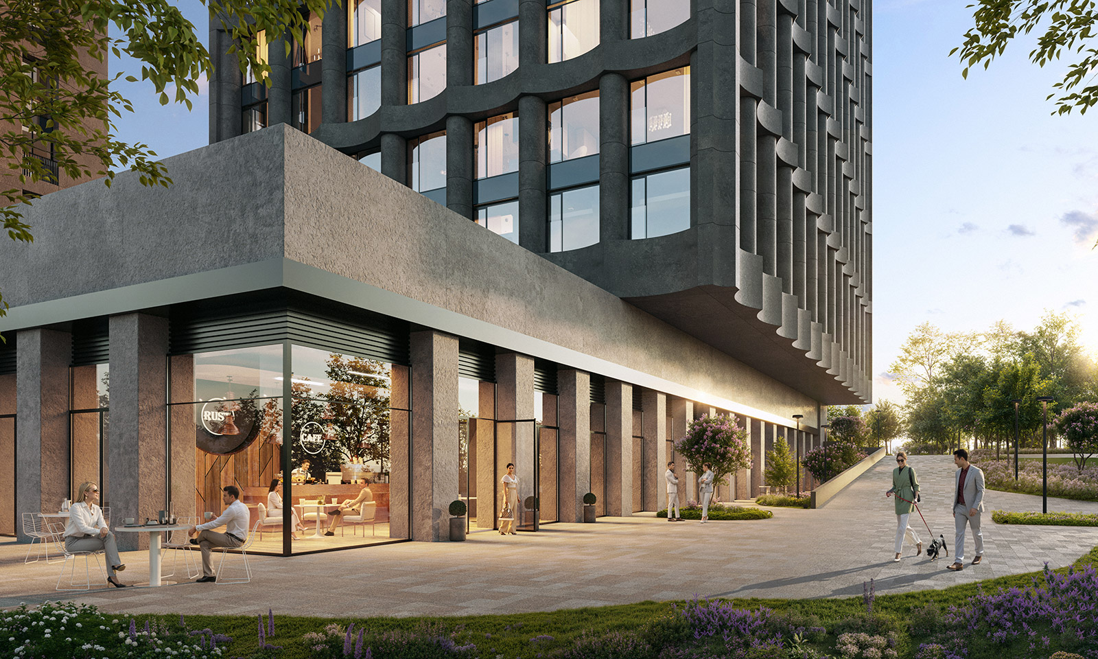 Концепцию благоустройства квартала МИРА разработала бюро «Дружба»: архитекторы спроектировали уличную зону ритейла с прогулочными маршрутами, выходящую к парку на набережной, и закрытый двор с функциональными локациями для резидентов.