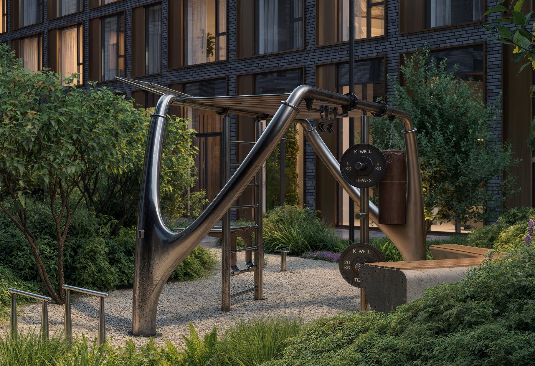 Воркаут-зоны, столы для настольного тенниса и другие площадки для активного отдыха и тренировок на свежем воздухе.