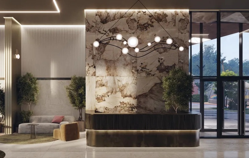 Круглосуточная ресепшен-служба обеспечивает высокий уровень сервиса и безопасности, а просторные холлы и удобная навигация делают пространство максимально функциональным. Лобби становится не просто входной группой, а полноценной частью жилой среды — стильной, удобной и соответствующей уровню проекта бизнес-класса.