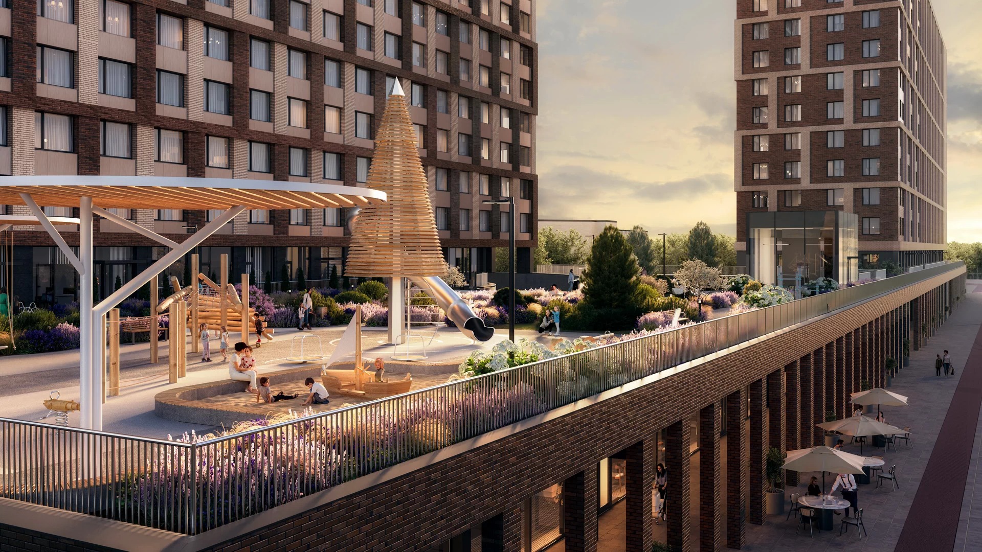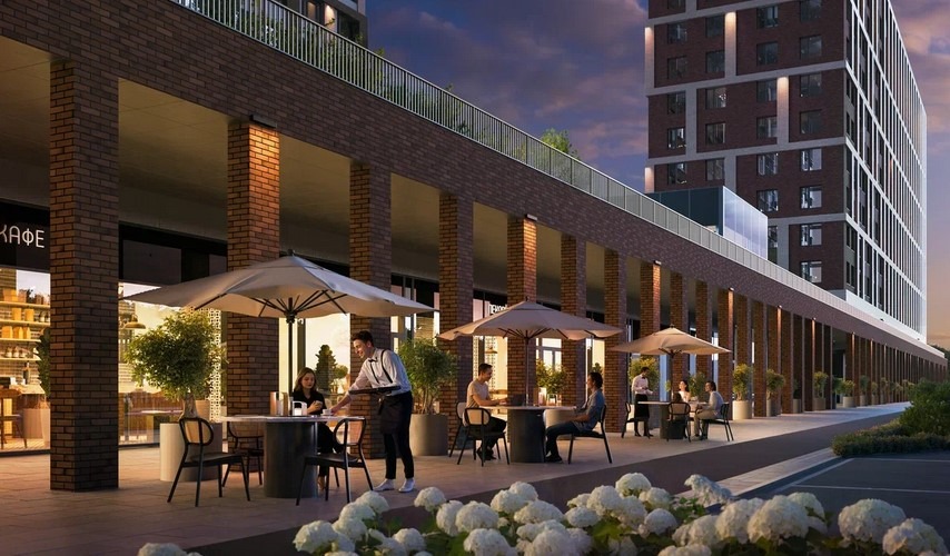 Архитектурная концепция выполнена в эстетике «тихой роскоши»: благородные оттенки фасадов, керамогранит и алюминиевые элементы создают элегантный и современный образ. Закрытая территория квартала благоустроена по авторскому проекту — двор-сад с всесезонным озеленением включает детские игровые зоны, площадки для воркаута и приватные пространства для отдыха.