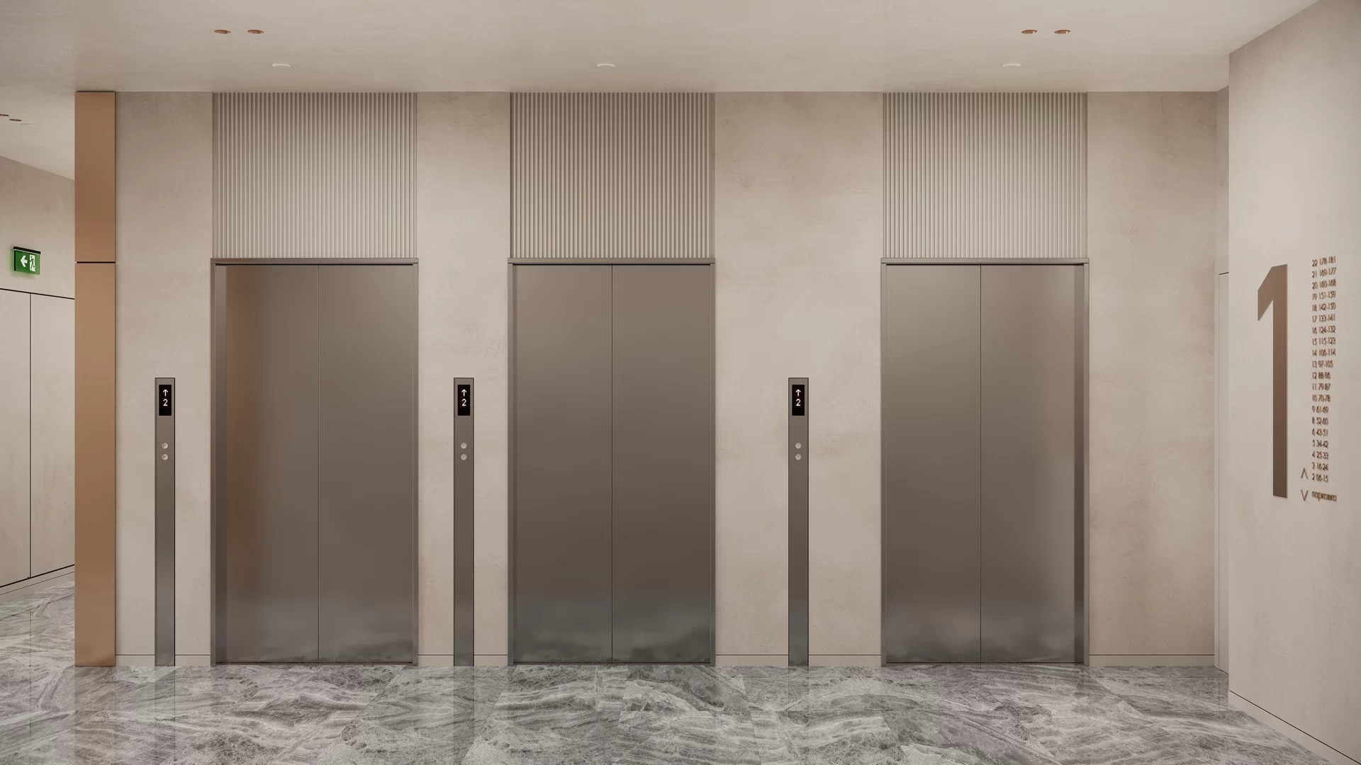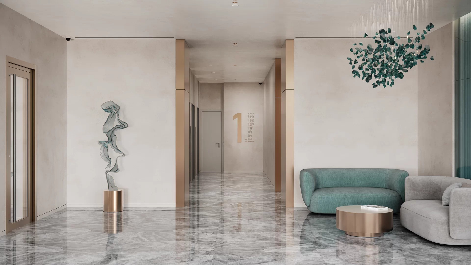 Входная группа, разработанная бюро архитектуры и дизайна KNKO в стиле современной роскоши, создает первое впечатление о комплексе — светлое и элегантное пространство.