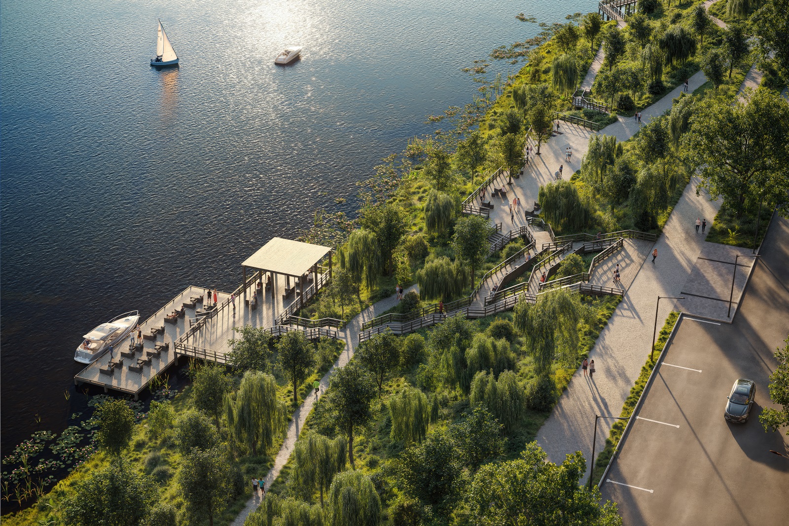 Пространство набережной продумано для разных сценариев отдыха. Верхний пешеходный маршрут одновременно выполняет функцию непрерывной беговой дорожки. Ниже проходит лесная тропа со смотровыми площадками и деревянными лавочками. Веломаршруты с комфортным покрытием и уютные зоны отдыха в тени деревьев гармонично дополняют естественный ландшафт берега Москвы-реки. Яркой архитектурной доминантой станет понтонный причал с прямым выходом с центральной площади жилого комплекса.