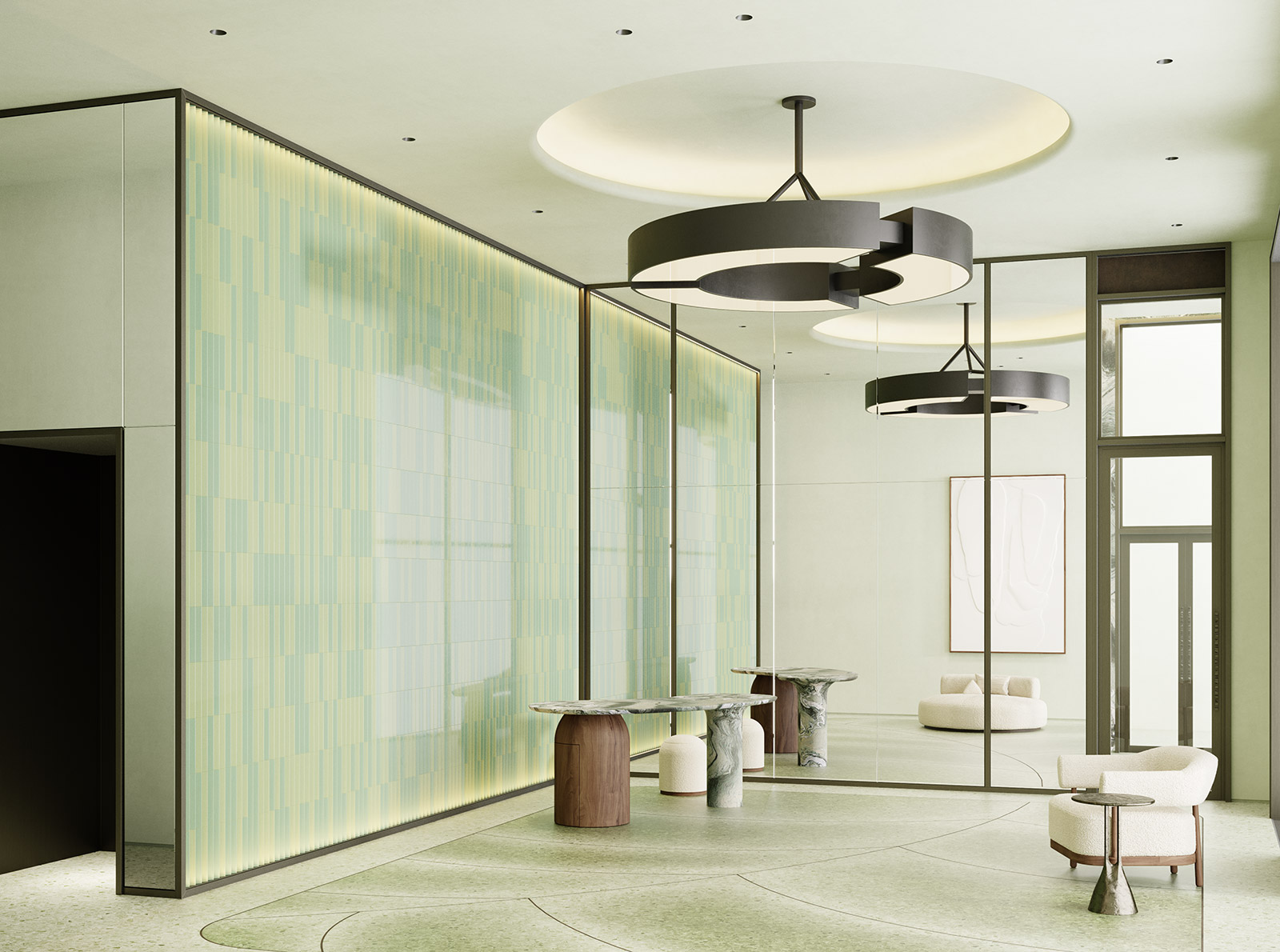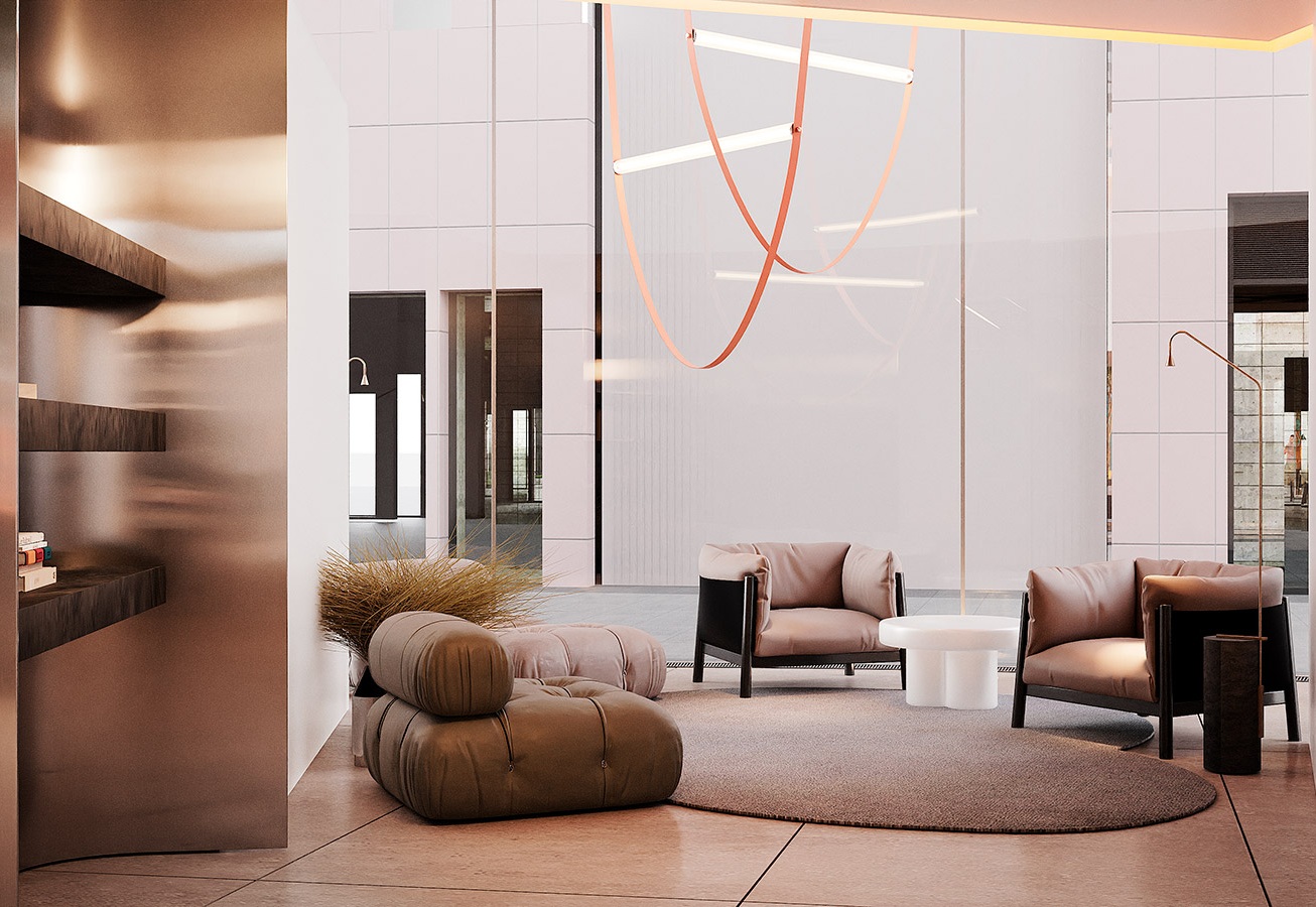 В гранд-лобби предусмотрены переговорные комнаты, уединённые рабочие зоны, мягкие диваны и удобные пространства для встреч, а также кофейня с авторским кофе. Здесь же организован сервис приёма посылок: курьер оставит доставку на ресепшен, а сотрудники комплекса передадут её вам в удобное время.