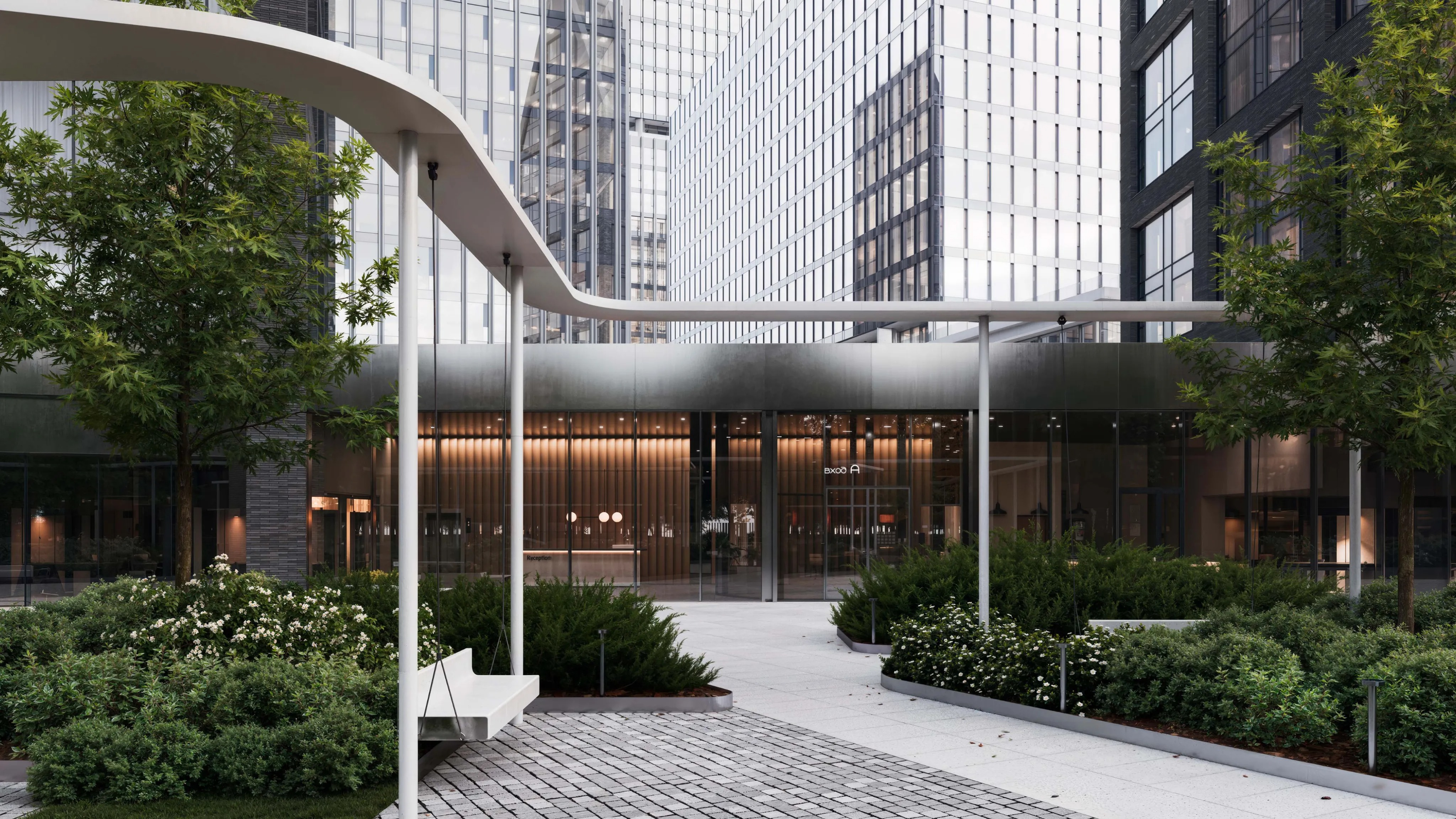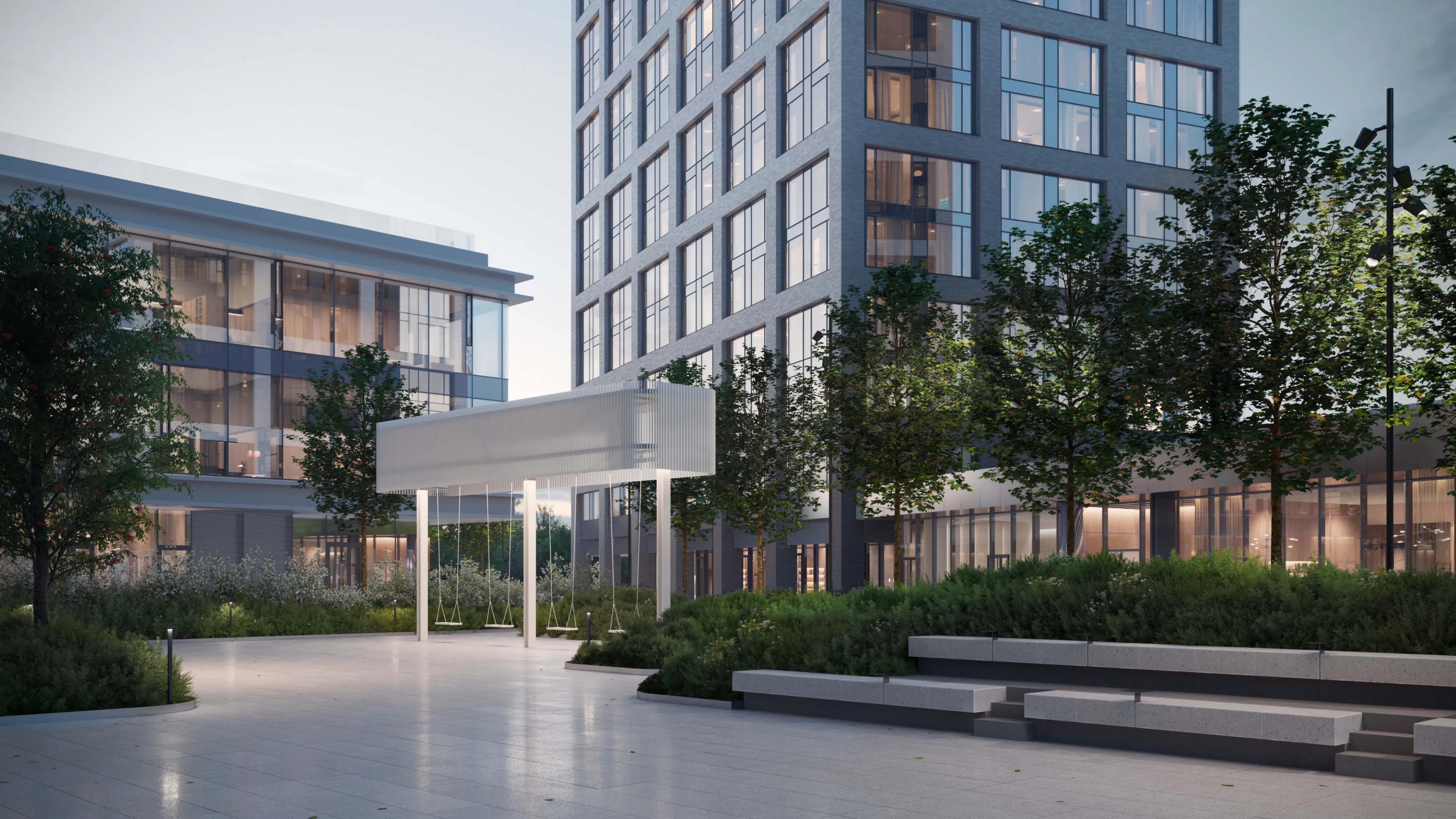 Сочетание строгой современной архитектуры, мягкого озеленения и функциональных зон для отдыха формирует атмосферу уединенного двора внутри квартала.