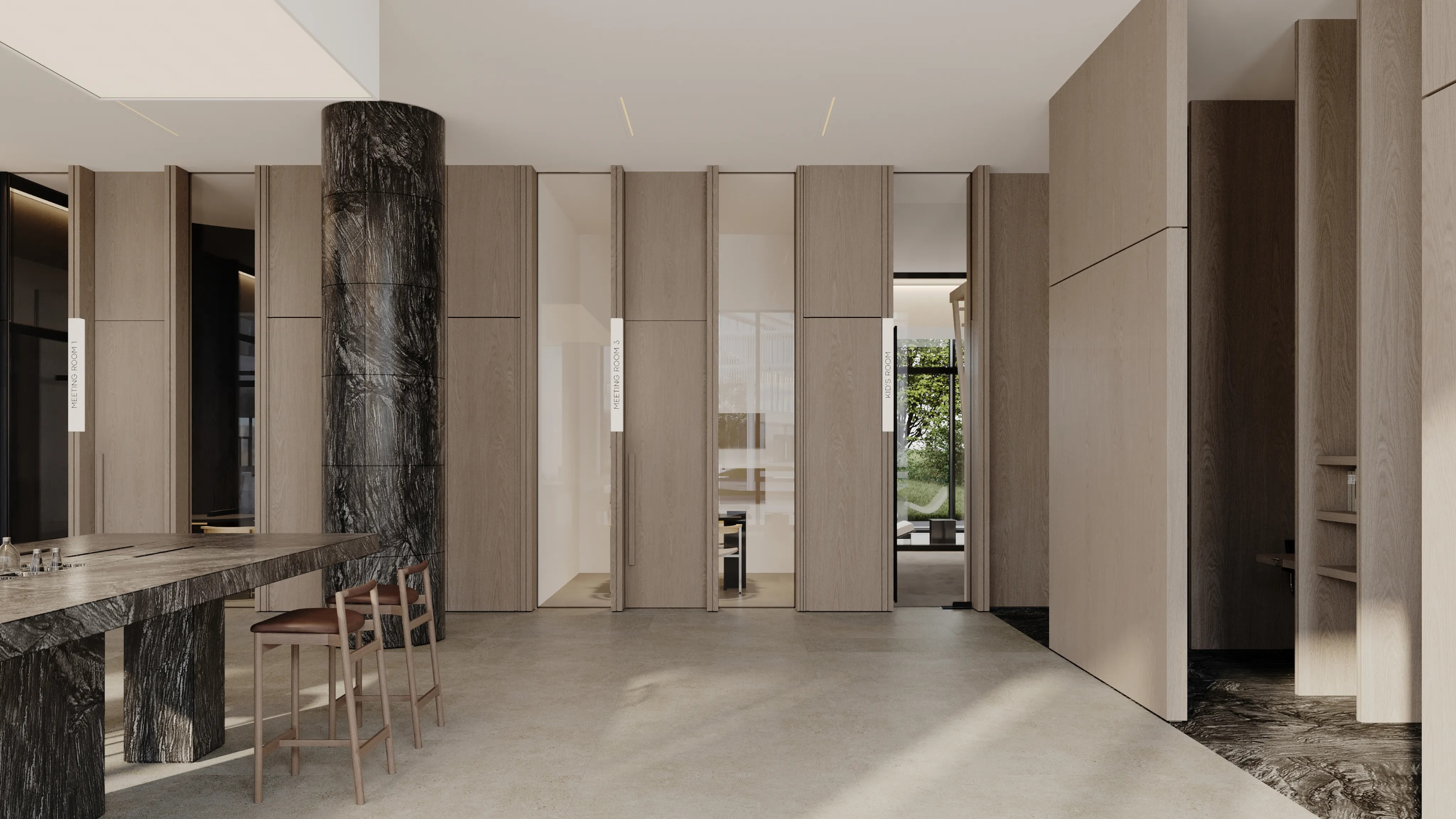 Лобби выполнено в современной минималистичной эстетике с акцентом на натуральные материалы и архитектурную выразительность форм. Пространство решено в теплой светлой гамме.